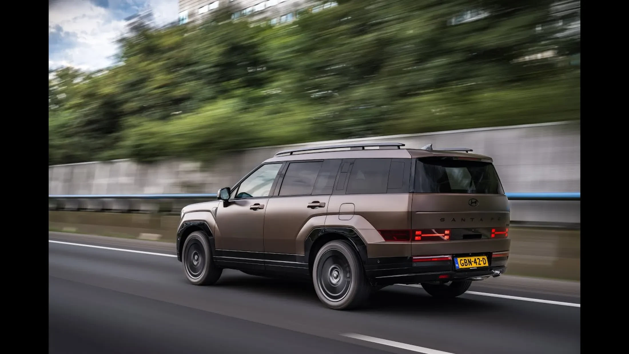 De achterzijde met de enorme achterklep en de rechte lijnen geeft de SANTA FE een stoere uitstraling. De H-vormige achterlichten harmoniëren met de H-vormige koplampen en maken de SUV al van grote afstand herkenbaar.